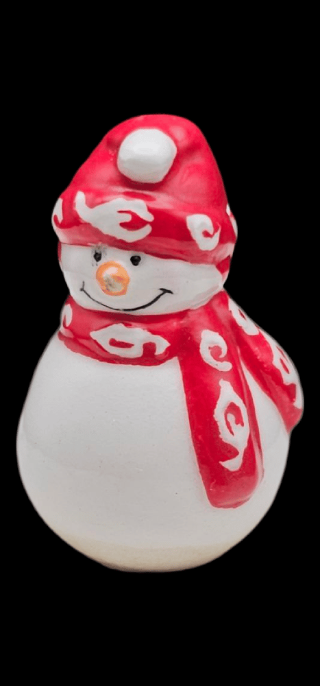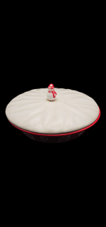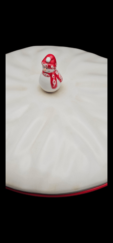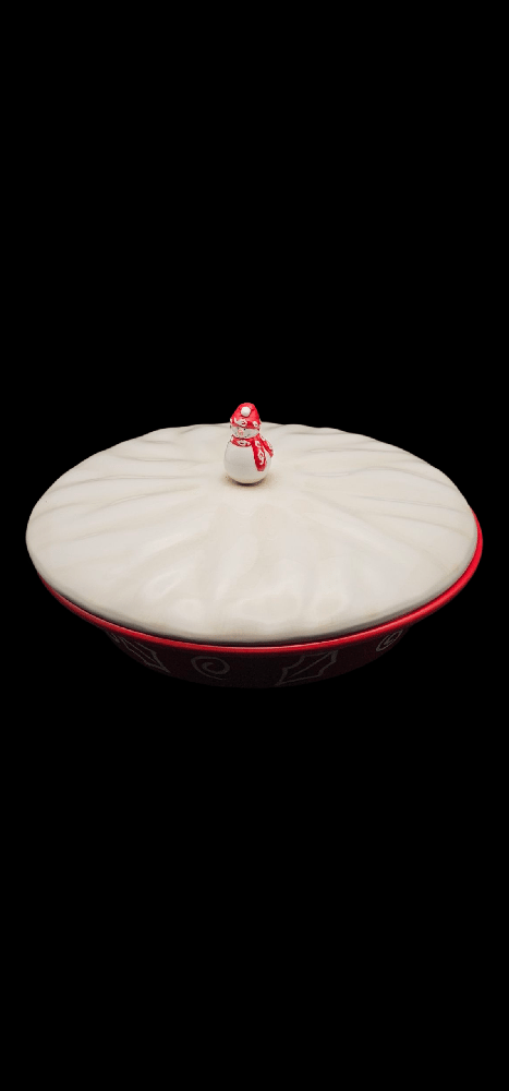 Measurements approximately 9 5/8" in diameter with a 9" opening for pie and 2 1/4" height, with lid and snowman 4 1/2"