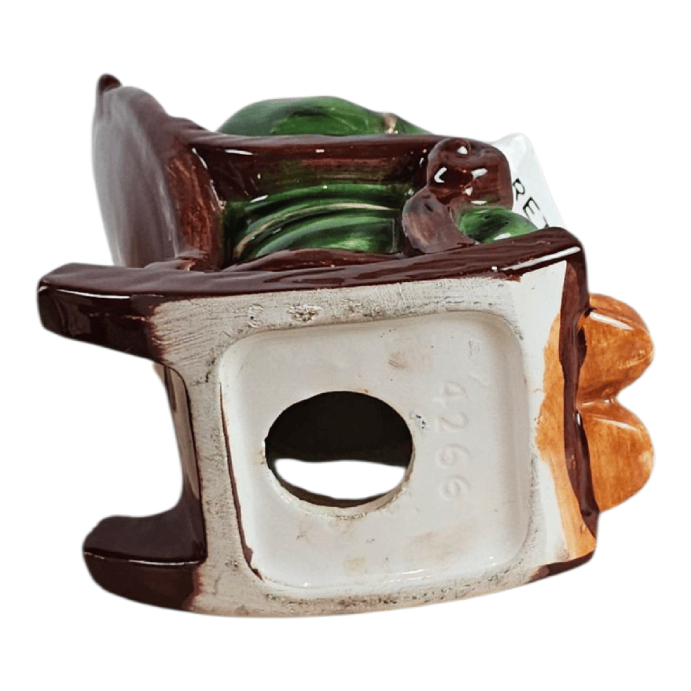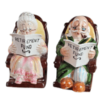 A pair of Lefton retirement piggy banks featuring "Grandpa and Grandma" type characters in rocking chairs. In good condition! Measuring approximately 7.5 inches tall by 5 inches wide. Grandfather bank is missing the stopper on the bottom.
