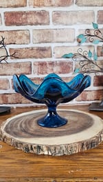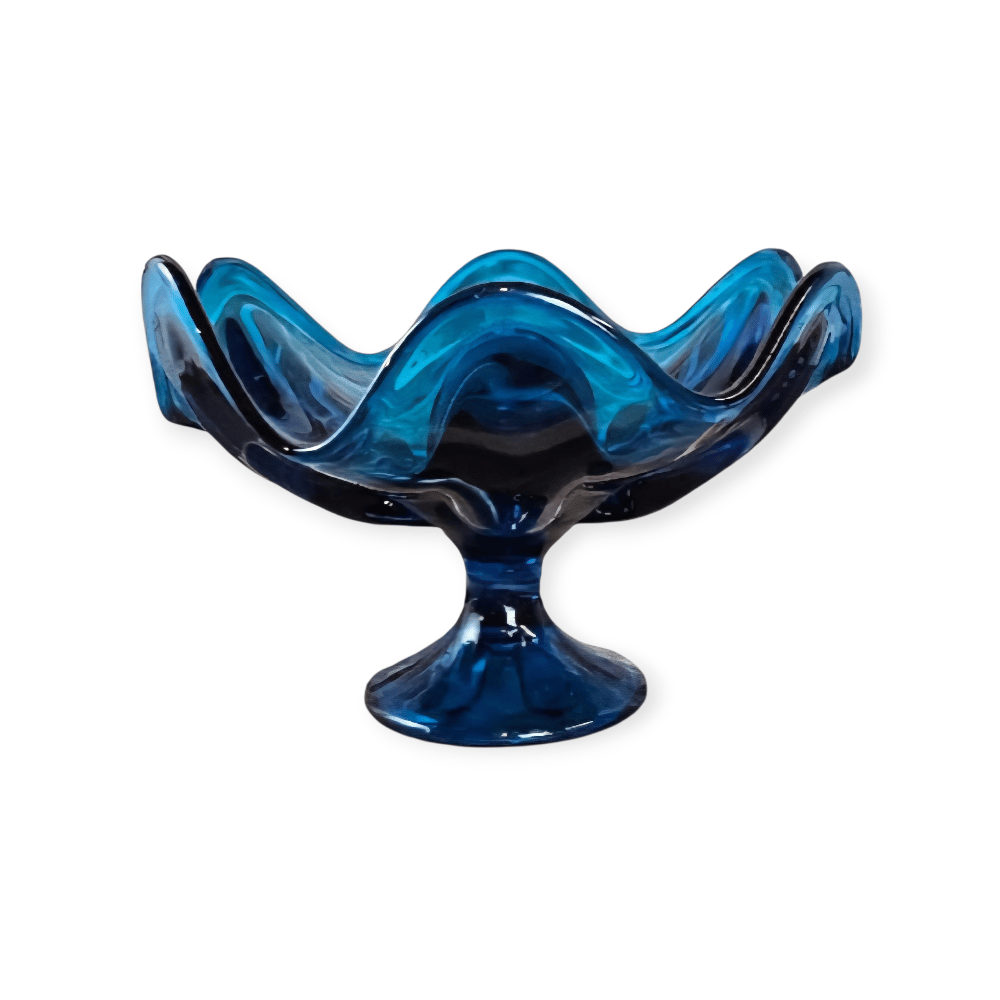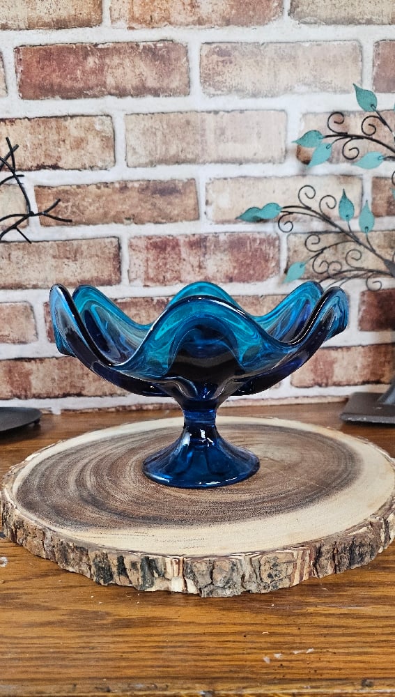 The Epic Six Petal Bluenique Viking Swung Glass Blue Compote is a vintage piece of art glass from the mid 20th century. Produced by the Viking brand in the United States during the 1960s-1970s, this decorative glass compote features a beautiful blue color and a unique six petal design. Perfect for adding a touch of retro charm to any space, this collectible item is a true representation of the vibrant and artistic era of Mid-Century modern design.