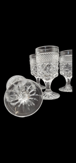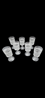 This set of 7 5.5 oz wine glasses by Anchor Hocking is in excellent condition. The Wexford pattern, clear color, and retro style make them a vintage find from the 1960s. These pressed glass glasses feature an etched decorative design and stand at 5 1/4" tall with a diameter of 2.25 inches. Perfect for adding a touch of nostalgia to your drinkware collection, these wine glasses are a charming addition for any home bar or dining table.