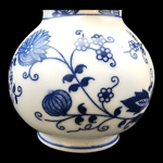 The Vienna Woods Japan Fine China Creamer in the Blue Onion Pattern is a vintage collectible piece made of porcelain. This original antique creamer features a blue and white Blue Onion design, typical of Victorian-era pottery. Standing at 4 inches tall and 3 inches wide, this creamer is a unique addition to any collection, showcasing the intricate craftsmanship of Vienna Woods and the classic Blue Danube theme.
