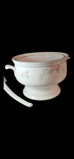 Vintage Pfaltzgraff Soup Tureen in Wyndam Floral pattern. Although this is a gorgeous piece it is not without imperfection. The laddle is in great condition with no chips or cracks.
