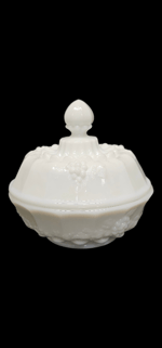 Beautiful milk glass Westmoreland candy dish with lid. Amazing detail with panel grape theme.