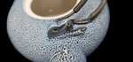 In great condition with a raised pebble glazed design and wrapped wire handle.