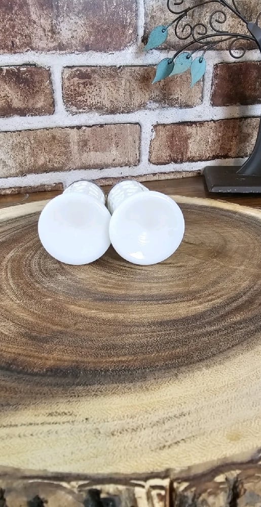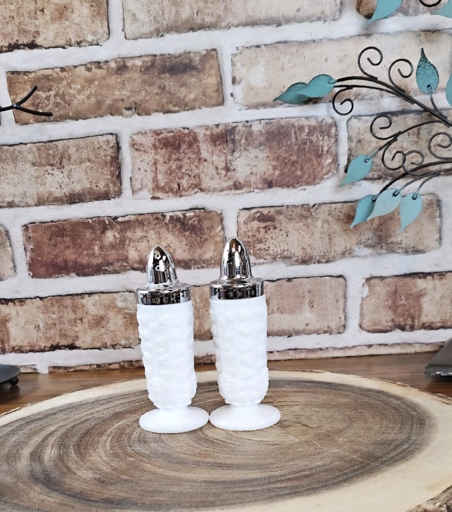 The Vintage Westmoreland Milk Glass Paneled Grape Salt and Pepper Shakers are a set of two elegant and decorative items perfect for adding a touch of Mid-Century Modern style to your dining table. Made in Pennsylvania, these original Westmoreland shakers feature a glossy white milk glass finish with a beautiful grape pattern design. At 4.75 inches tall and 1.75 inches in diameter, these salt and pepper shakers are a charming addition to any collection of vintage glassware. The floral and garden theme adds a whimsical touch to your table setting, making them a unique and lovely choice for collectors and enthusiasts alike.